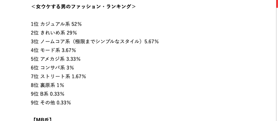 20・30代の女性300人に訊いて、「カジュアル系」が一番人気でした。