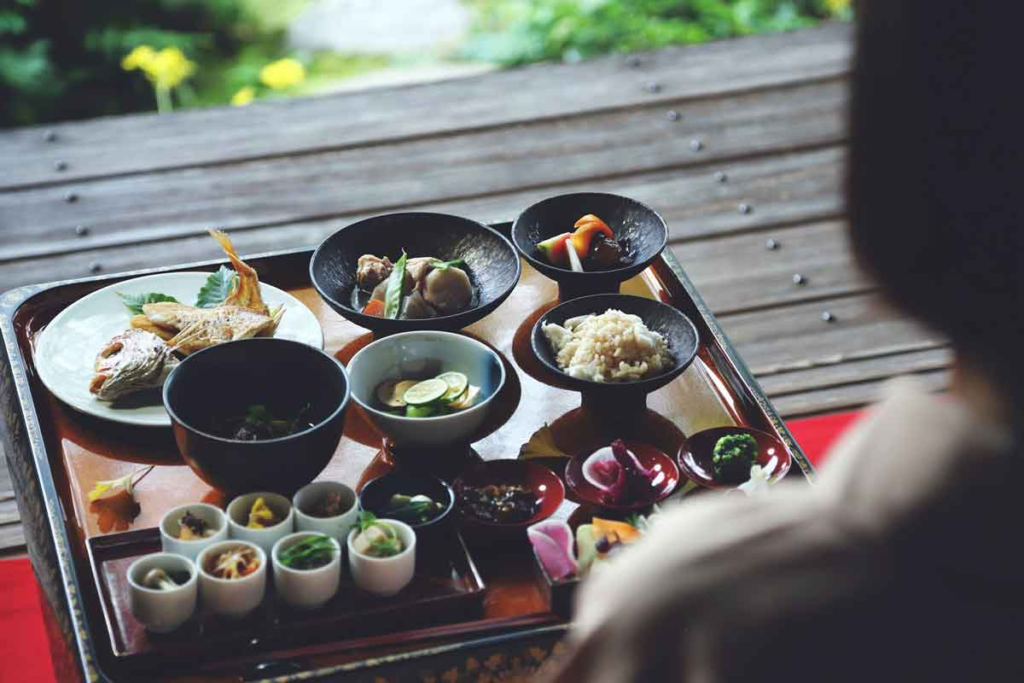 夕食前には、地元に伝わる神楽や雅楽などの伝統芸能が贅沢にも貸切で披露されます。続く夕食は地元の旬の食材を贅沢に使用したお殿様御膳。器や盛り付けにもこだわり抜かれた料理の数々は、目でも舌でも楽しめる美食体験です。夜には月見体験も用意され、静寂に包まれた城からの眺めは、昼間とはまた違った趣を見せてくれます。
