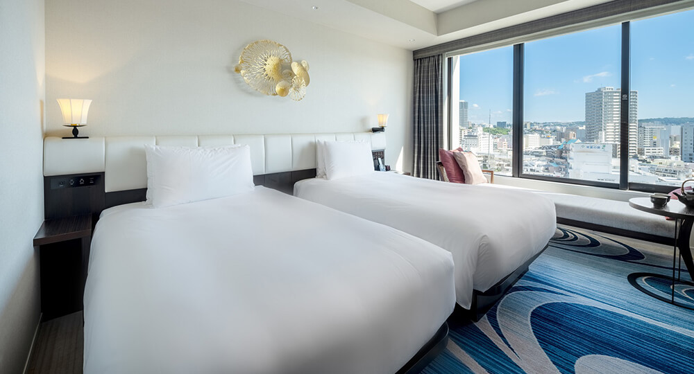 客室は「沖縄の風と水を感じる」をコンセプトにデザインされ、琉球文化とラグジュアリーホテルの要素が見事に融合しています。広々としたツインルームやデラックスツインルームは、沖縄の海と空、太陽の暖かさをイメージした爽やかな空間。客室からは那覇市内を一望でき、おしゃれなやちむん焼きの茶器でくつろぎのティータイムも楽しめます。